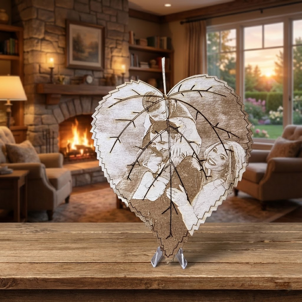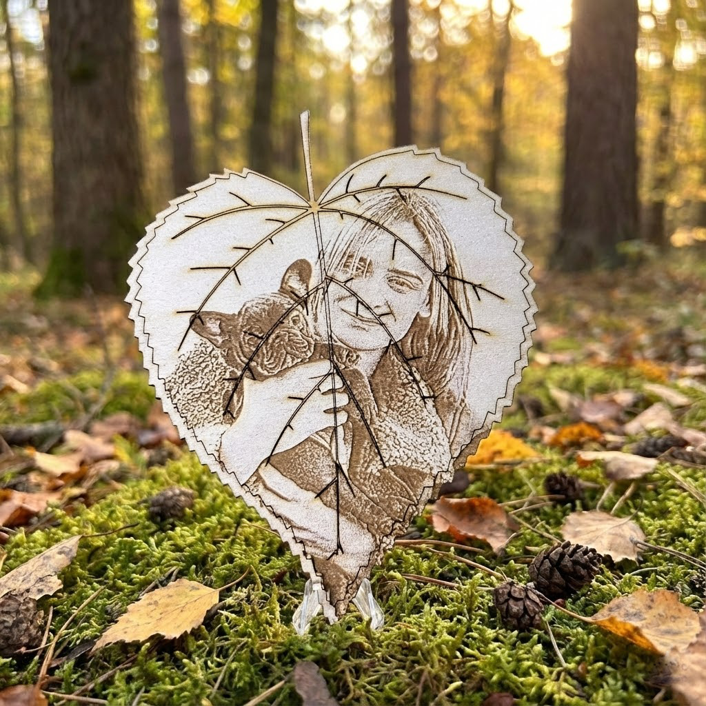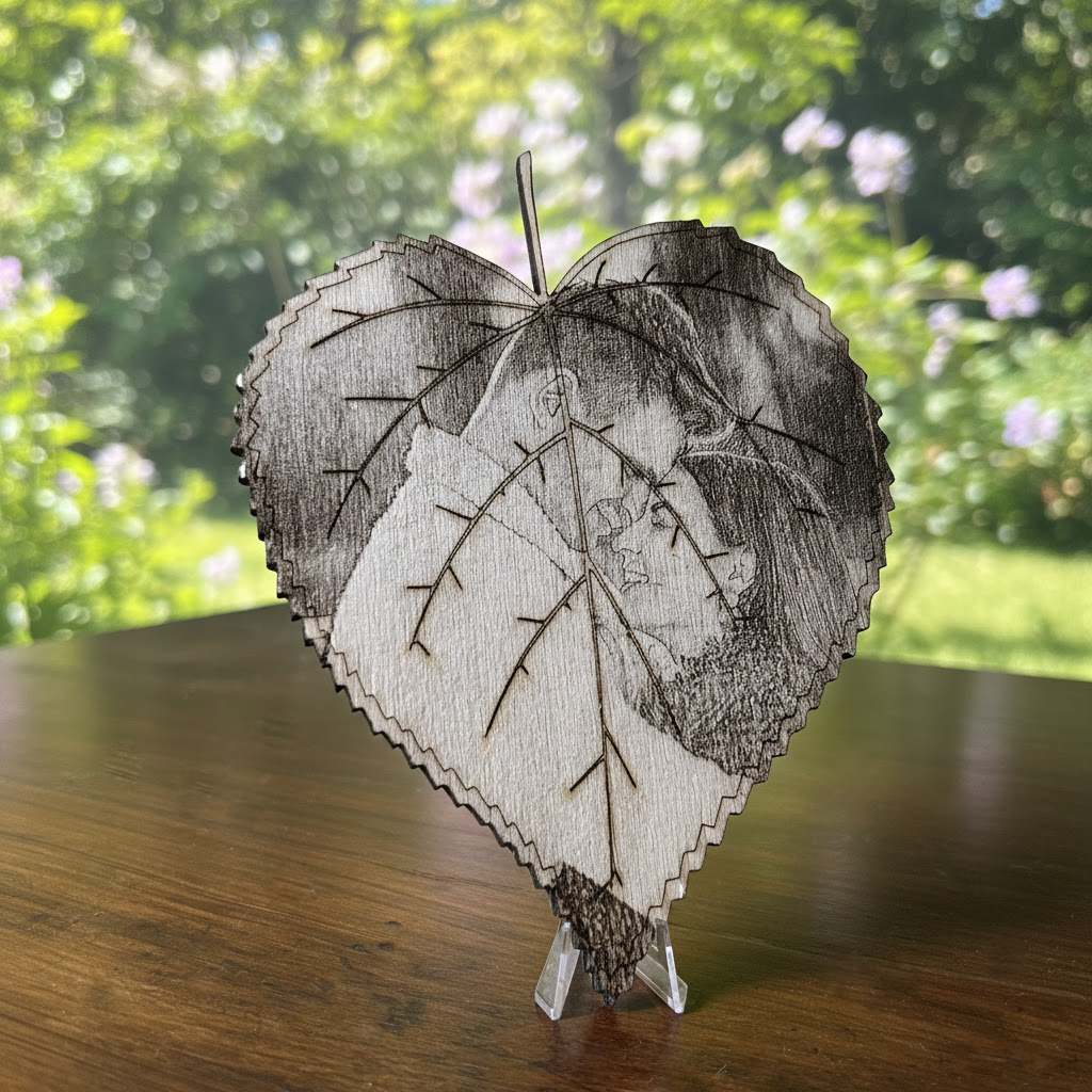 La Foglia dei Ricordi™ – Ritratto personalizzato Inciso su Legno a Forma di Foglia